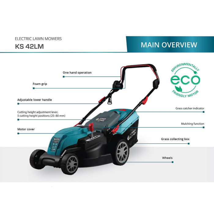 Електричні газонокосарки Könner & Söhnen® мають просту конструкцію, завдяки чому підготовка до роботи, обслуговування чи зберігання здійснюється швидко, легко та без застосування додаткового інструменту. - контейнер для трави: