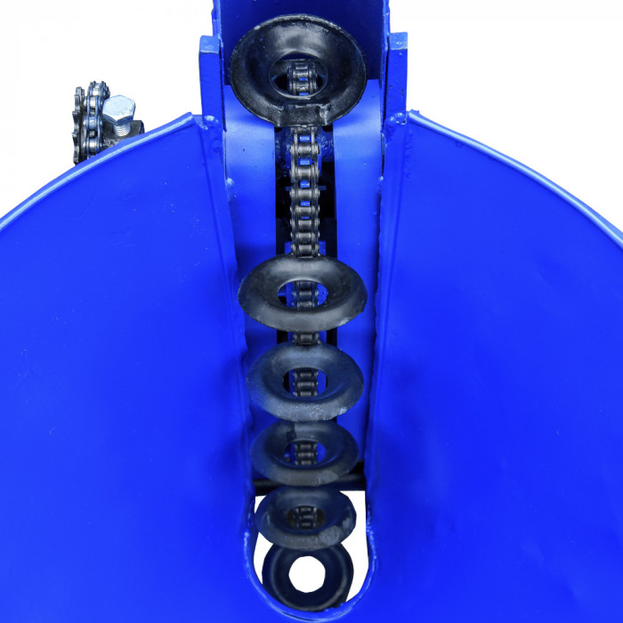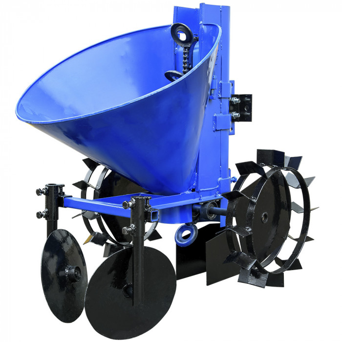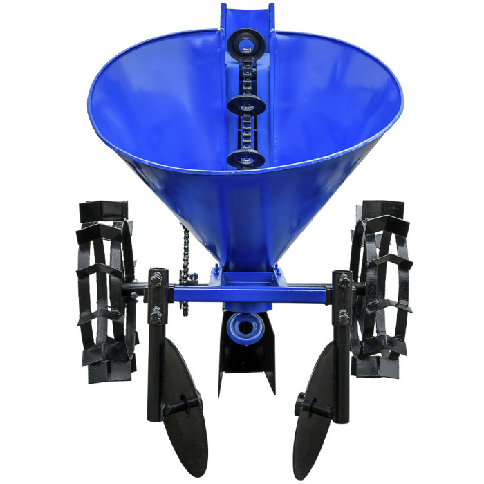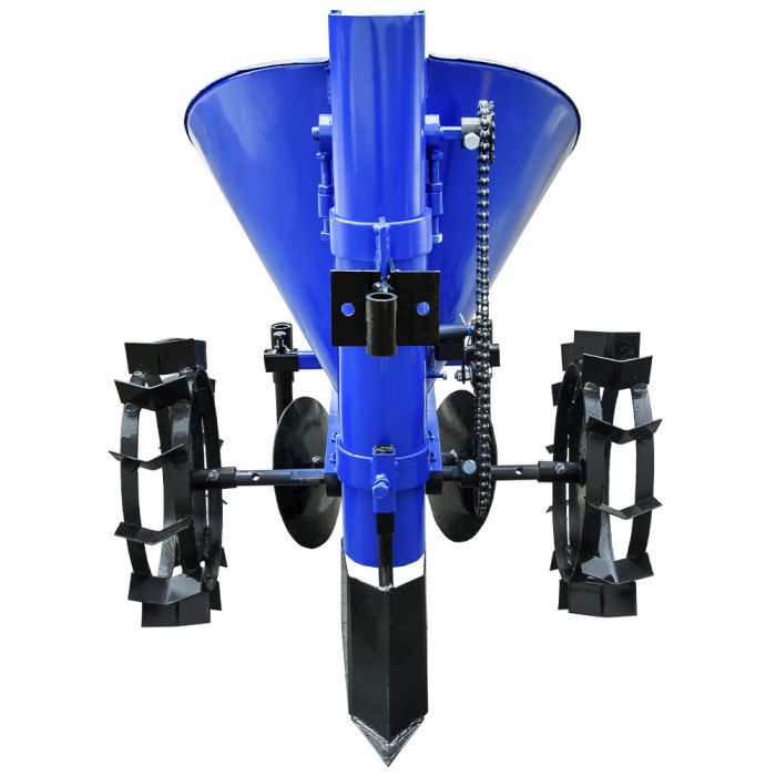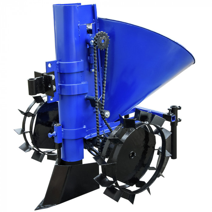 Картофелесажатель мотоблочный К-1Ц имеет простую конструкцию и существенно облегчает процесс посадки картофеля в один ряд. Привод механизма посадки картофеля осуществляется через цепь от грунтозацепов. Ложечки для укладки картофеля расположены на цепи. Бункер конусной формы емкостью 20 л.