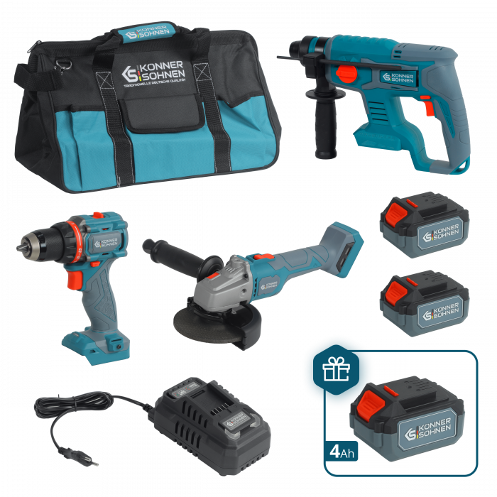 Könner & Söhnen KS RHAGD 20V SET 3 – Набір акумуляторного електроінструменту 3-в-1: дриль, кутова шліфмашина та перфоратор. У комплекті 2 × 4.0 А·год Li-Ion акумулятори, швидкий зарядний пристрій 4.5 A та зручна сумка. Для будь-яких ремонтних робіт вдома чи у майстерні.