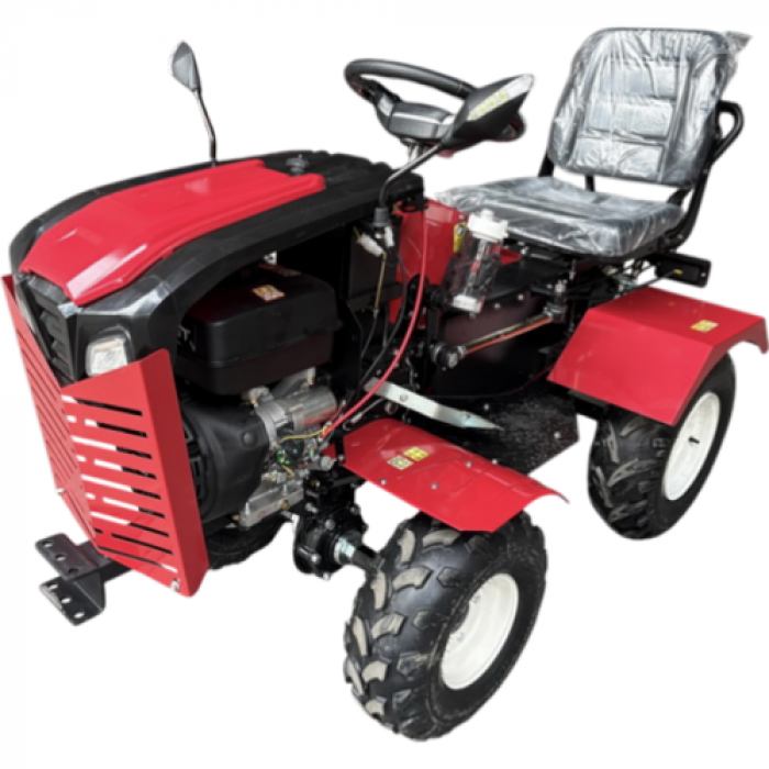 Трактор имеет колёсную формулу 4×4, что улучшает проходимость на рыхлой или влажной почве и позволяет уверенно работать на участках со сложным покрытием. За торможение отвечают задние дисковые тормоза
