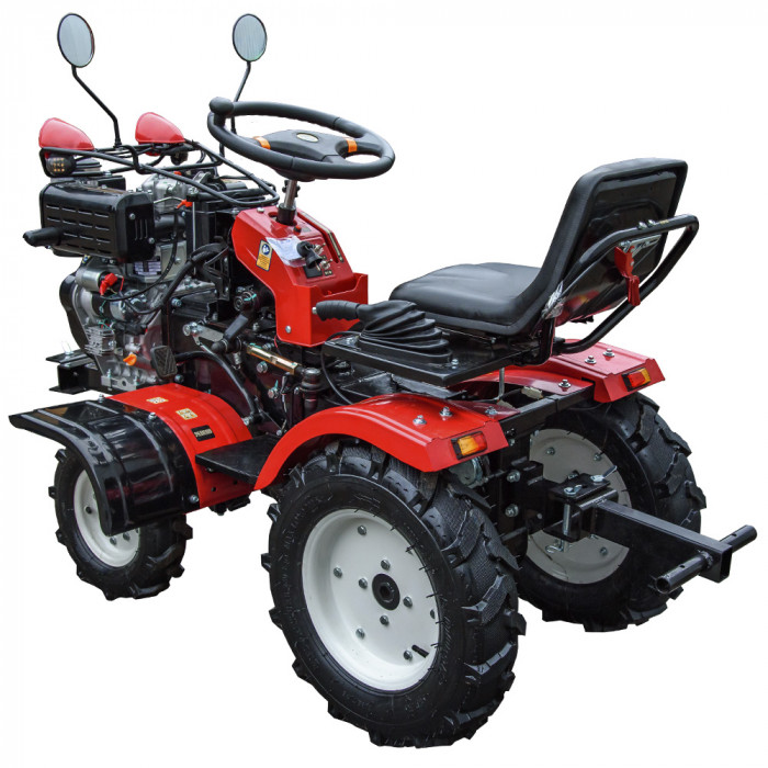 Трактор оборудован мотоблочной буксирной сцепкой, которая позволяет присоединять навесное оборудование. Металлические передние и задние крылья повышают защиту механизмов и обеспечивают долговечность конструкции.