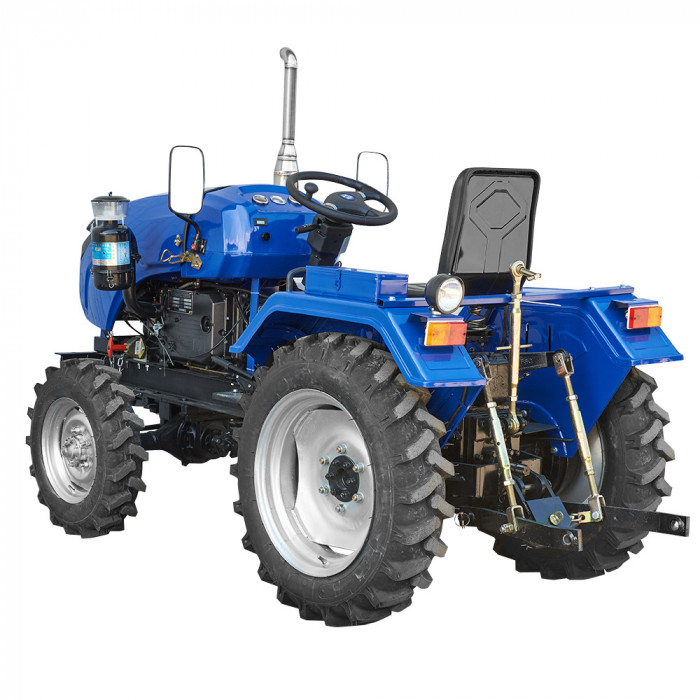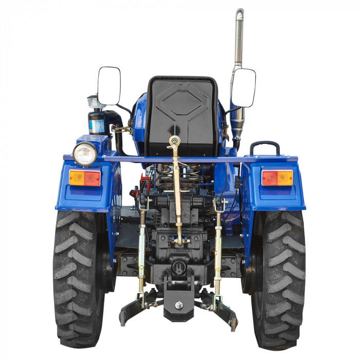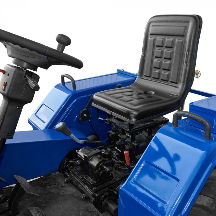 Механическая шестерёнчатая трансмиссия с коробкой передач (3+1)×2 обеспечивает базовый набор скоростей для большинства аграрных действий. Передний мост — ведущий, муфта сцепления — однофункциональная. Рулевое управление — механическое с рукояткой для быстрого маневрирования. Система реверса и блокировка заднего дифференциала отсутствуют, что делает управление максимально простым.
