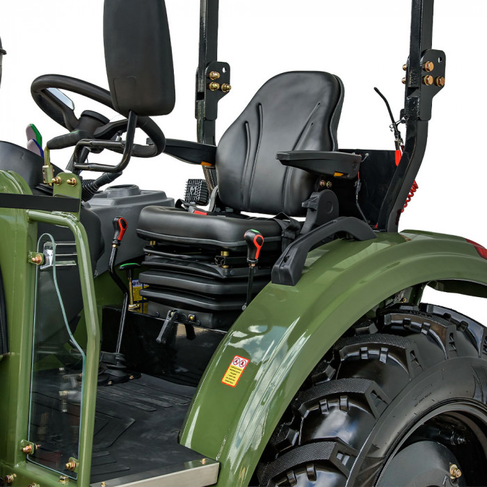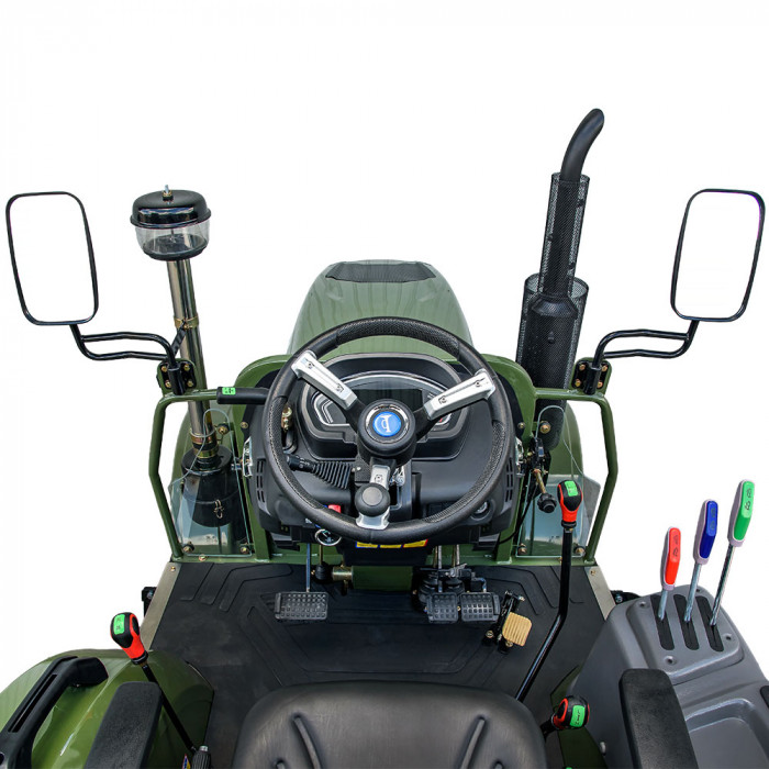 Механическая шестерёнчатая трансмиссия с комбинацией передач (4×2)+(4×2) и отдельной реверсивной коробкой обеспечивает манёвренность и универсальность. Двухдисковое сцепление обеспечивает плавную передачу мощности. Полный привод 4×4, гидрообъёмное рулевое управление с отдельным насосом, раздельные тормозные педали с возможностью синхронизации — всё это обеспечивает контроль и надёжность на любом покрытии.