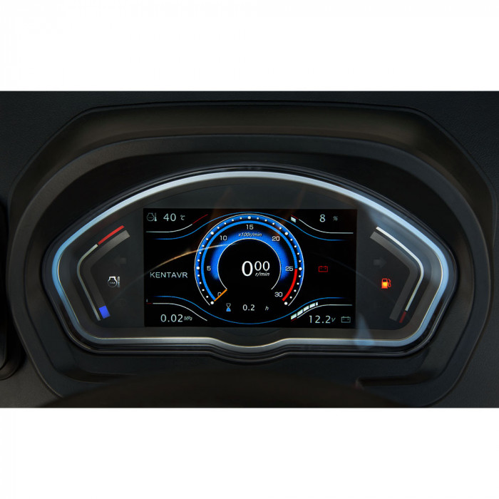 Модель оснащена комфортным сиденьем с амортизатором, регулировкой и подлокотниками, имеет ровный пол и многофункциональную электронную приборную панель. В базовой комплектации — электрoрозетка для прицепа, сигнализация, фары, зеркала, стоп-сигналы, магнитола, кондиционер и отопление кабины.