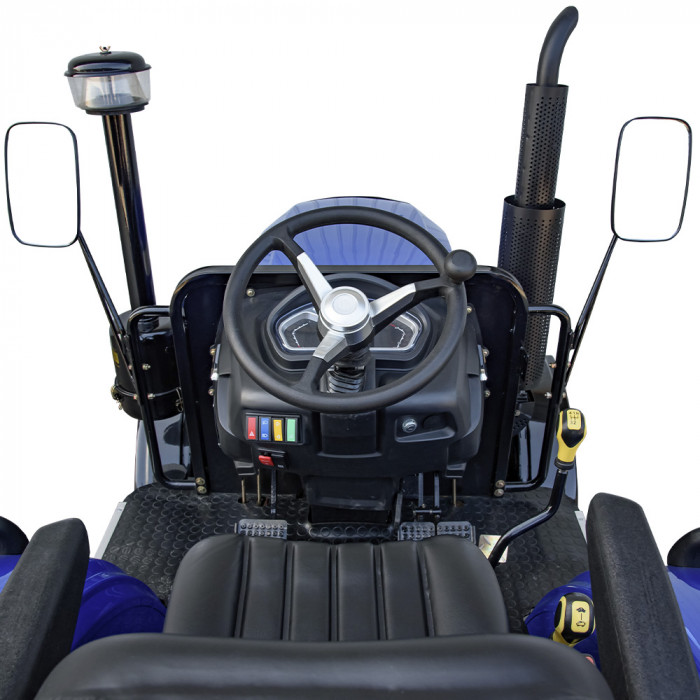 Сиденье на амортизаторе с подлокотниками регулируется по расстоянию до руля. Электропанель с цифровым индикатором давления, ровная платформа, комплект внешнего освещения и электророзетка для прицепа — всё для удобной эксплуатации в любое время суток. Металлические крылья, зеркала заднего вида и сигнальная система входят в базовую комплектацию.