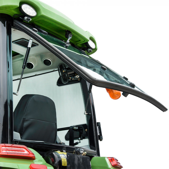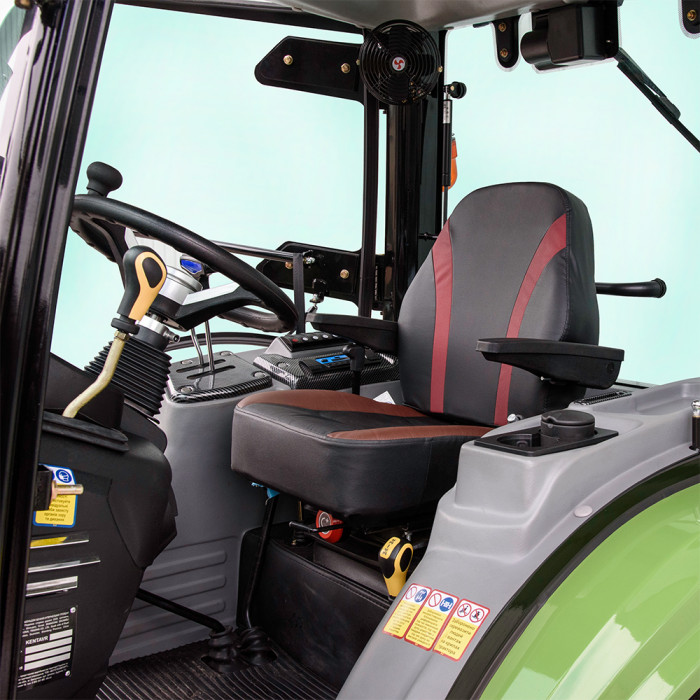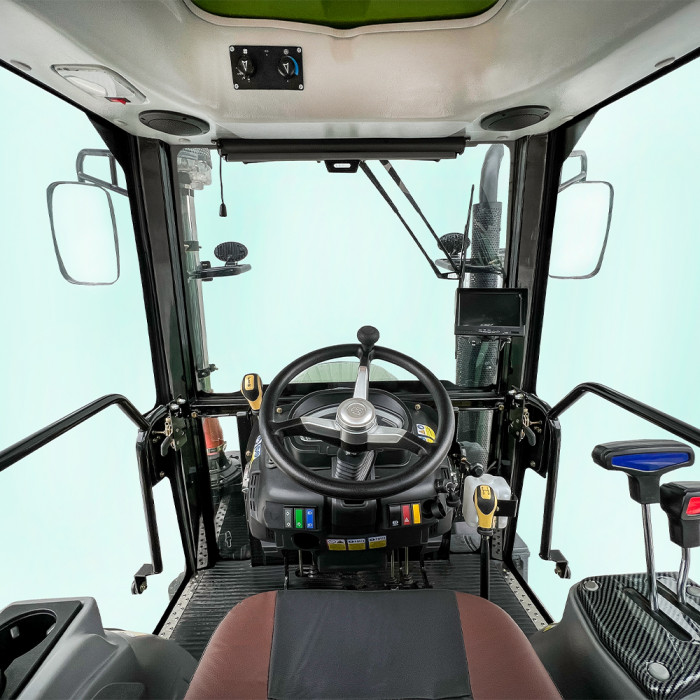Кабина полностью укомплектована для комфортной работы: с кондиционером, отоплением и ровным полом. Сиденье водителя на амортизаторах, регулируется по расстоянию и оснащено подлокотниками для удобства. Приборная панель — многофункциональная, с цифровым индикатором давления.