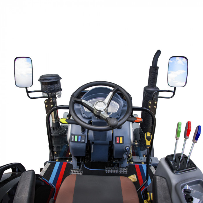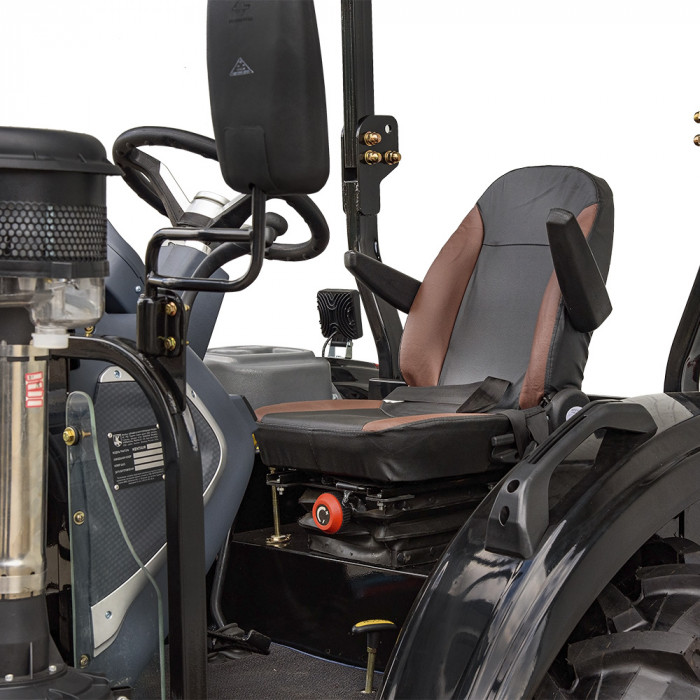 Несмотря на отсутствие кабины, трактор имеет удобное сиденье с амортизатором и регулировкой, ровный пол, цифровую приборную панель, а также электрoрозетку для прицепа, освещение, зеркала, сигнализацию и фары. Магнитола, кондиционер и обогрев не предусмотрены, что делает эту модель простой и недорогой в обслуживании.